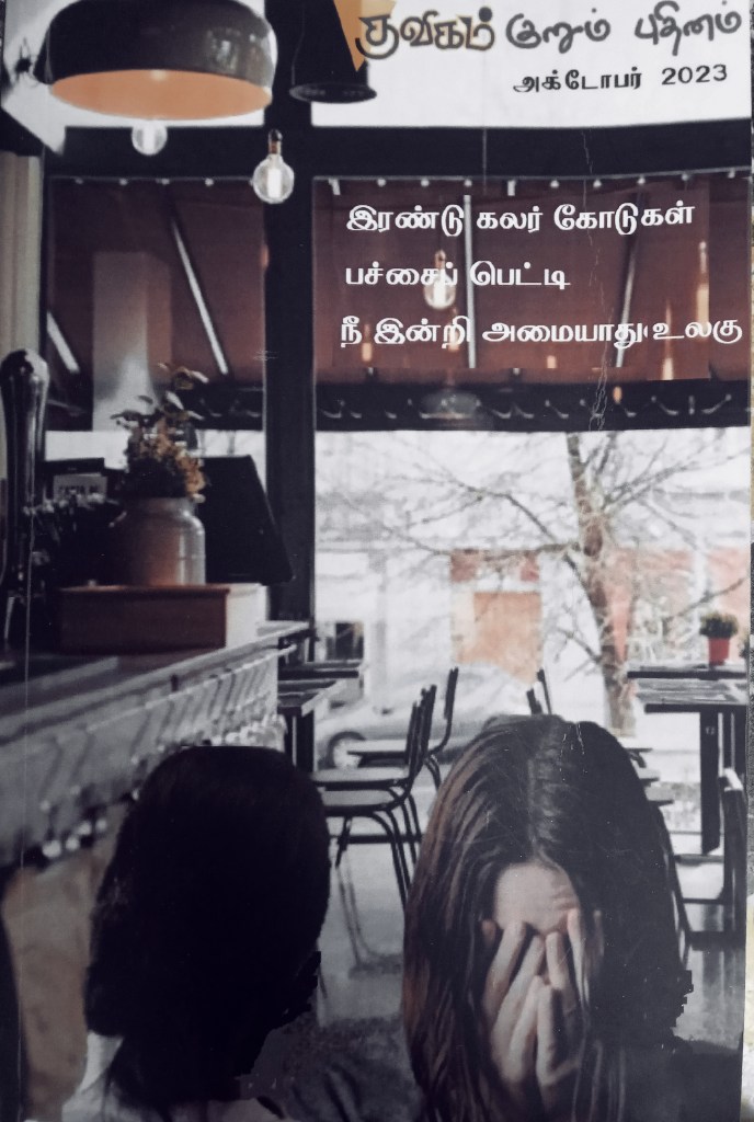 குவிகம் குறும் புதினம் அக்டோபர் மாத (2023) இதழில் என்னுடைய ‘இரண்டு கலர் கோடுகள்’ குறுநாவல் வெளியாகி இருக்கிறது.